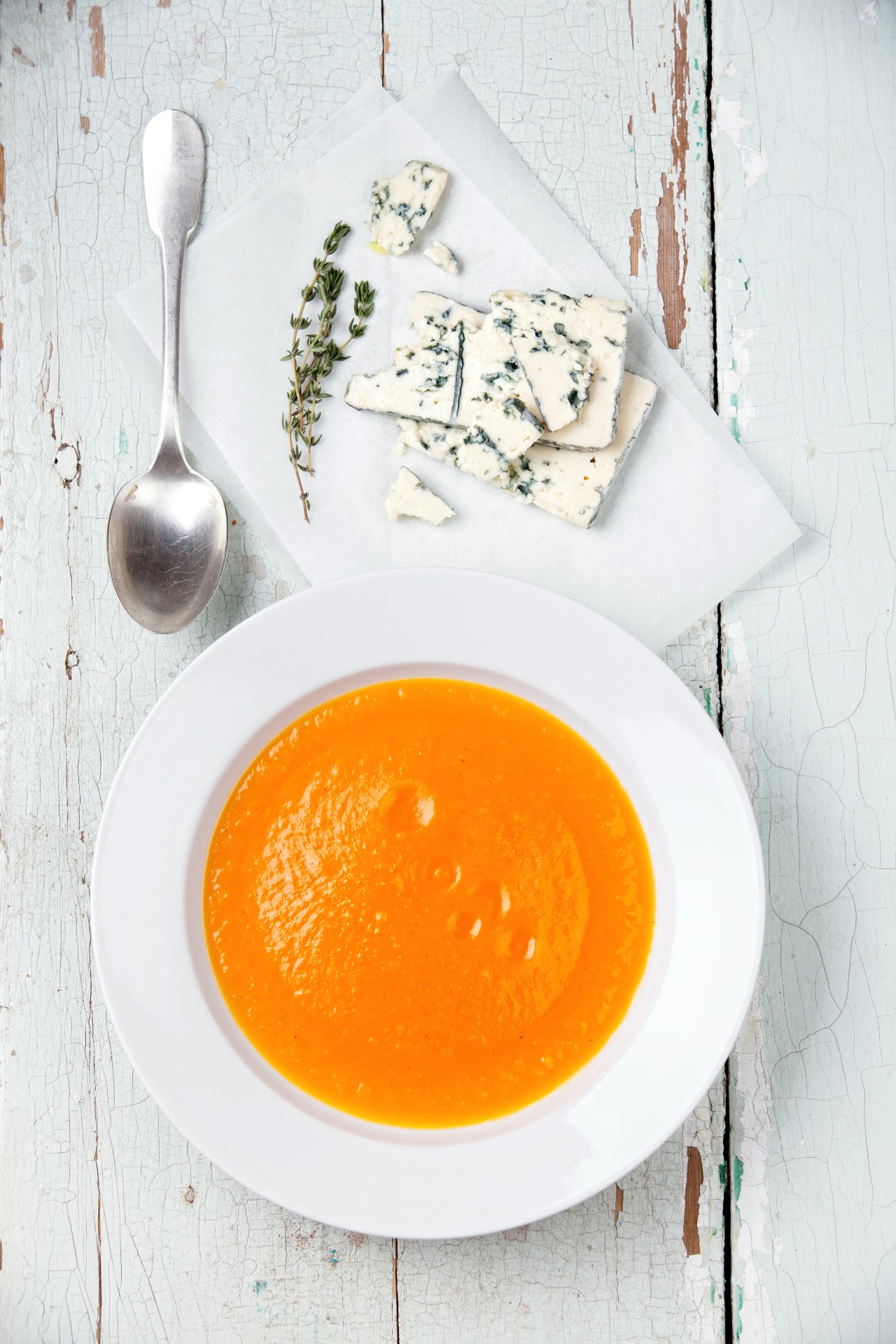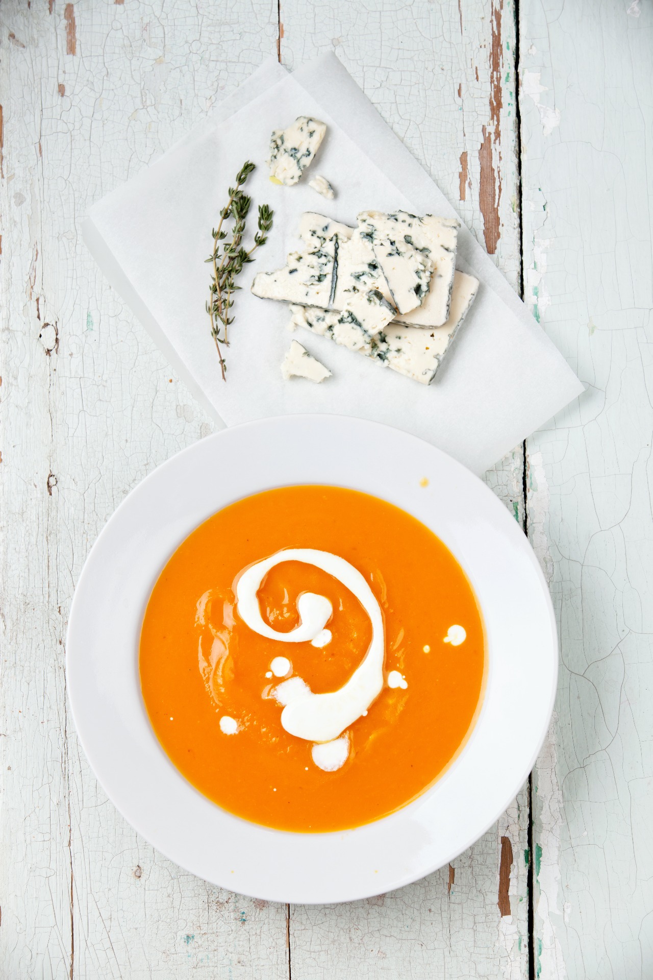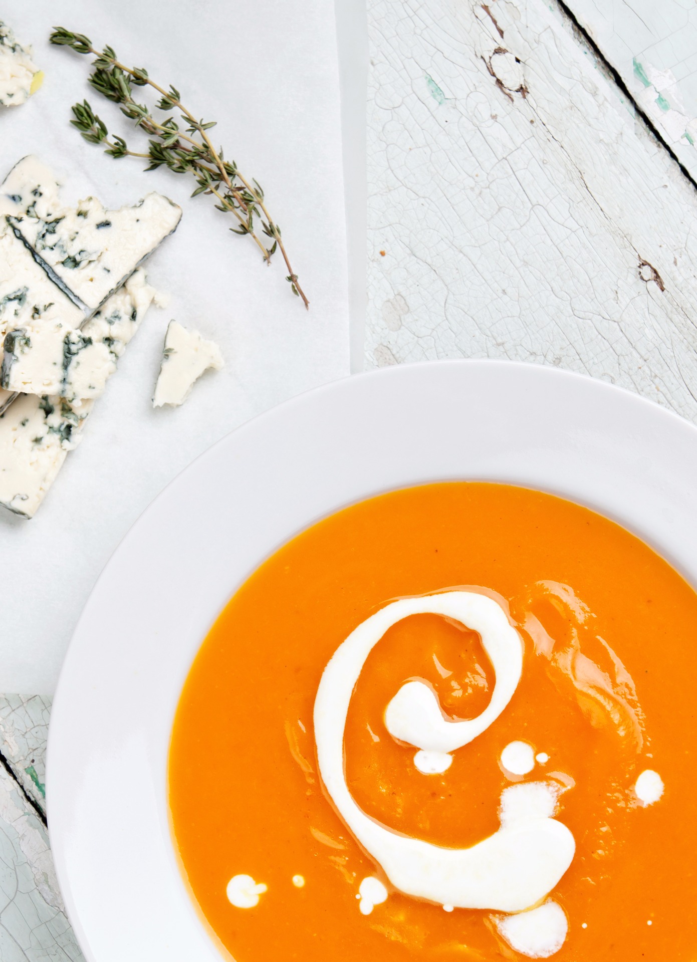 Creme de abóbora picante funciona como um perfeito estimulante durante os dias de outono frios e chuvosos. Sua cor laranja vai fazer você sorrir e seu sabor rico vai deixar você apaixonado. Gosto de misturá-lo com vários tipos de queijo, ervas e especiarias. A combinação que funciona muito bem é de sálvia fresca e tomilho seco. O enfeite em forma de sementes de abóbora torradas é simplesmente uma obrigação.